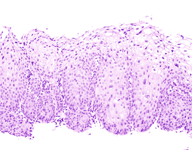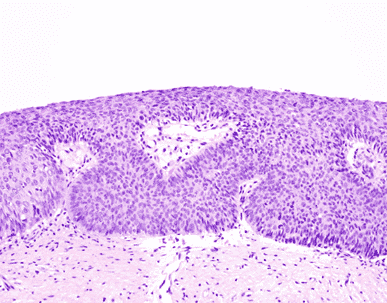 Histologically, the basal layer is somewhat disordered but cytologically bland. There is maturation toward the epithelial surface, where koilocytes may be prominent (Figure 5).