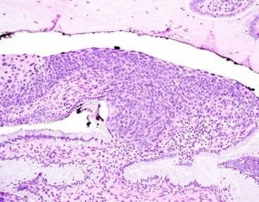 Histologically, HSIL is characterized by significant architectural disorder, cell crowding, and cytologic atypia in the basal layer. There is generally impaired (CIN 2) or no (CIN 3) maturation toward the epithelial surface, and mitoses are frequently conspicuous in the superficial epithelial layers. Microscopic involvement of endocervical crypts is common (Figure 7) and should be noted in the pathology report.