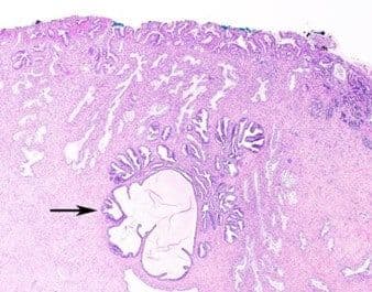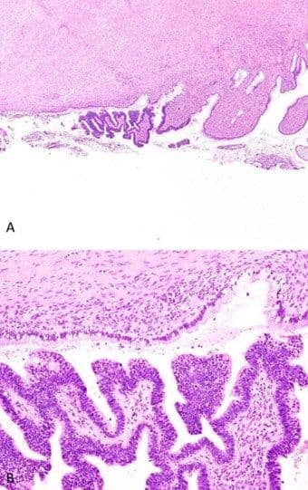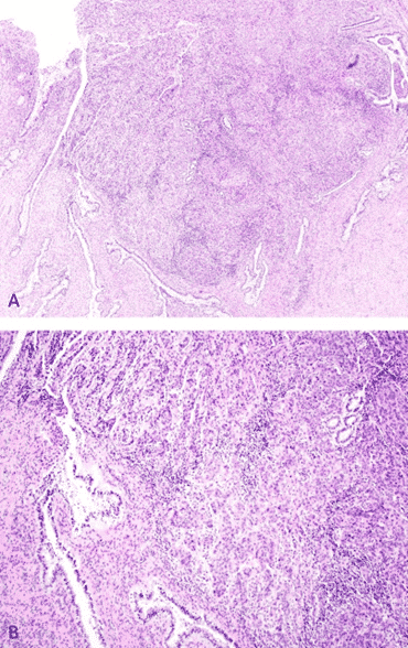 The incidence of adenocarcinoma has risen in recent decades, such that it now accounts for 25% of cervical carcinomas [82]. Endocervical adenocarcinoma may be associated with the same spectrum of high-risk HPV serotypes seen in squamous cell carcinoma. However, HPV 18 is significantly more common in adenocarcinoma than in squamous cell carcinoma. Up to 70% of endocervical adenocarcinoma and adenocarcinoma in situ is associated with a high-grade squamous lesion. Such cases are thought to arise from divergent tumor differentiation following a single high-risk HPV infection.