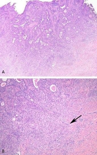 Pronounced desmoplastic stromal reaction may be visible around cell nests (Figure 9A, 9B, arrow). Lymphovascular space invasion may also be present, especially in more deeply invasive carcinomas.