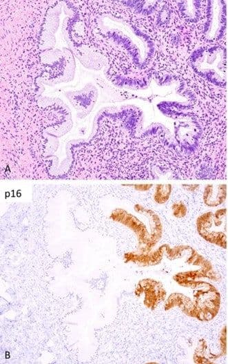 Partial gland involvement by AIS is common and can be highlighted by positive p16 immunostaining in the lesional cells (Figure 12A, 12B). AIS is most commonly identified at the transformation zone and may spread up to 3 cm upward in the endocervical canal [83]. Importantly, AIS may be multifocal, and it is not unusual to find residual tumor after negative conization margins [84].