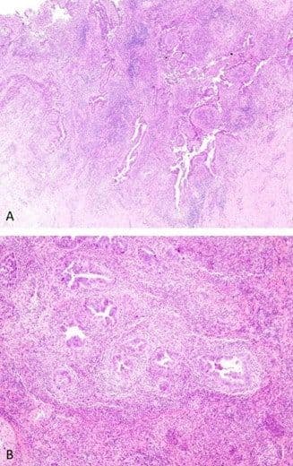 Squamous cell carcinoma is the most common histological subtype of cervical cancer. Squamous cell carcinoma of the cervix is most commonly linked to HPV 16 infection, although multiple other high-risk HPV serotypes are also associated with squamous cell carcinoma, including HPV 18, 31, 33, and 45, among others. Grossly, tumors may be firm indurated masses, polypoid, or ulcerated. Histologically, squamous cell carcinoma appears as infiltrative sheets and irregular nests of angulated to round cells with coarse chromatin and nucleoli (Figure 8A, 8B). Necrosis is common [76].