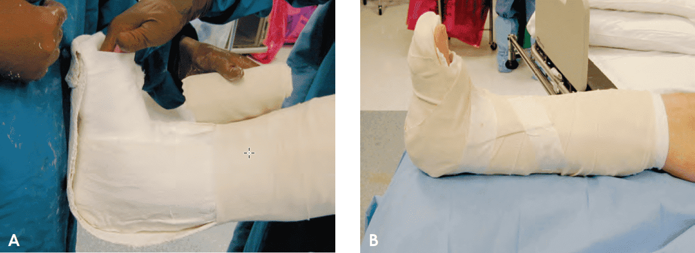 Іммобілізуйте переломи великогомілкової кістки для мінімізації болю та подальшого ушкодження м’яких тканин, а також зниження ризику компартмент-синдрому. За можливості перевагу надають гіпсовим лонгетам, які іммобілізують стегно, коліно та гомілковостопний суглоб.