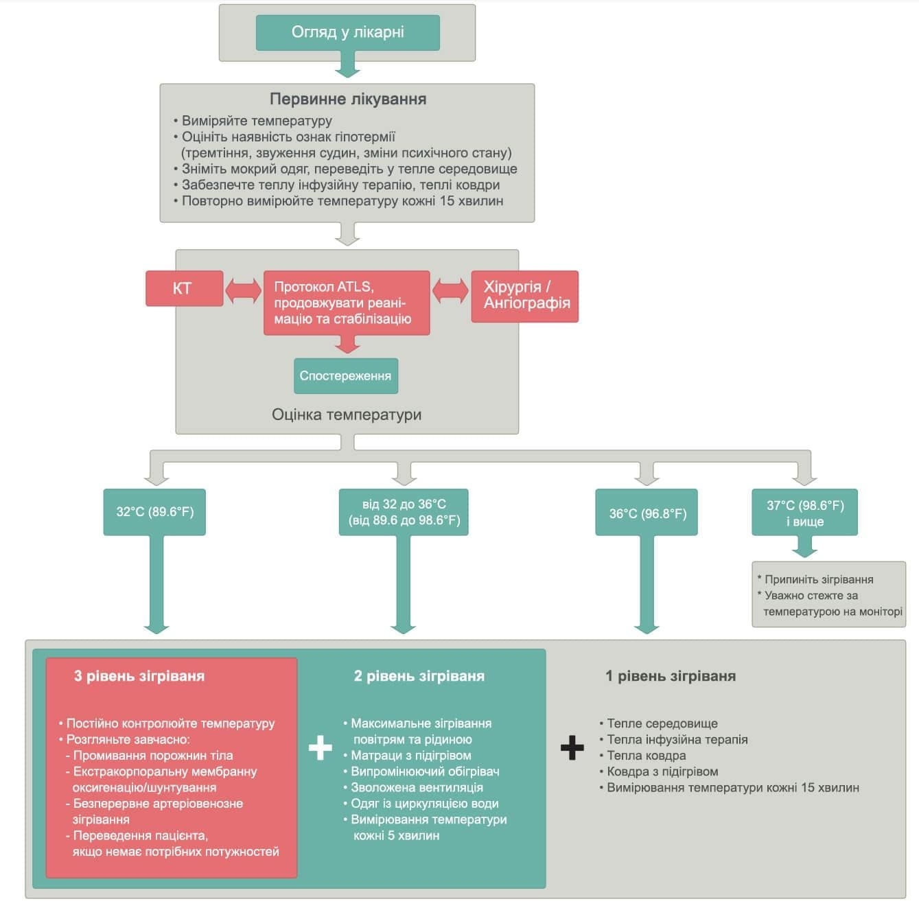 | Внутрішнє • Зігріваюча інфузійна терапія • Промивання шлунку або товстої кишки • Перитонеальний лаваж • Промивання середостіння • Підігріте інгаляційне повітря або кисень | Помірна (ГТ I НТ11I) (від < 32 до 28° C (< 89,6–82,4 F)) і важка гіпотермія (НТ111 і НТ IV) (від < 28 до < 24°C) (<82,4–<75,2 F)) |