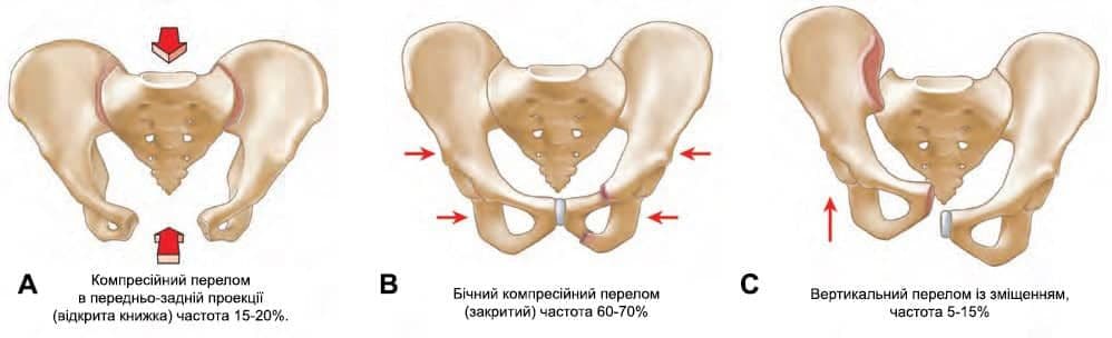 Пошкодження тазового кільця може виникнути під час ДТП за участю автомобіля, мотоцикла, наїзду на пішохода, прямого розчавлення або падіння. Переломи кісток тазу діляться на чотири типи, ґрунтуючись на моделях сили травми: передньо-задній компресійний перелом, бічний компресійний перелом, вертикальний зсувний перелом і комбінований механізм перелому (зобр. 5–8).