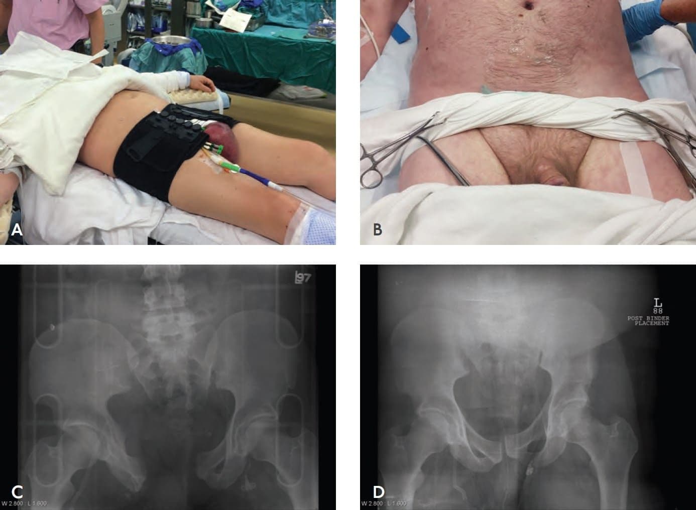 Оскільки травми тазу, пов’язані з великим крововиливом, призводять до ротації кісток тазу, внутрішня ротація нижніх кінцівок може допомогти контролювати кровотечу за рахунок зменшення об’єму тазу. Накладання шини на пошкоджений таз може зменшити потенційну тазову крововтрату. Простирадла, тазова шина або інший пристрій може забезпечити достатню тимчасову фіксацію для нестабільного тазу, якщо його накласти на рівні великих вертлюгів стегнової кістки (зобр. 5–9).