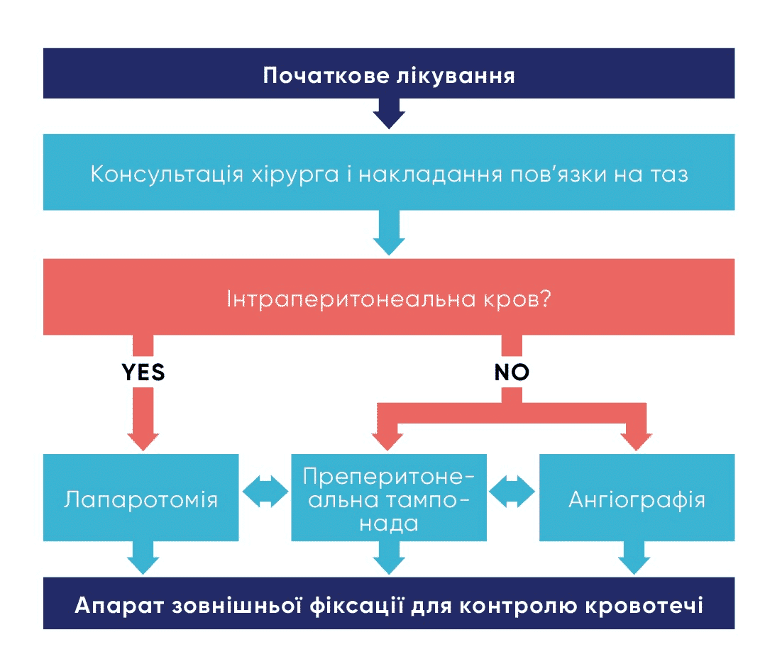 Хоча остаточна допомога пацієнтам із геморагічним шоком і переломами тазу відрізняється, один із алгоритмів лікування показано на зобр. 5–10.