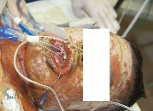 Обструкція дихальних шляхів може бути викликана не лише прямим ушкодженням (наприклад, вдиханням гарячого повітря), але й масивним набряком, що виникає внаслідок опікової травми. Набряк зазвичай з’являється не відразу, а ознаки непрохідності спочатку можуть бути незначні, допоки стан пацієнта не погіршиться. Рання оцінка необхідності ендотрахеальної інтубації має дуже важливе значення. Факторами, що підвищують ризик обструкції верхніх дихальних шляхів, є великі площа та глибина опіків, опіки голови та обличчя, інгаляційні ушкодження, супутні механічні травми та опіки в ротовій порожнині (Зобр. 9-1).