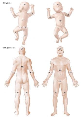 1. Рідинна реанімація необхідна для підтримки перфузії тканин в умовах постійної втрати рідини внаслідок запалення. Запальна реакція, що призводить до проблем із кровообігом, безпосередньо пов’язана з розміром і глибиною опіку. У розрахунку розміру опіку враховують лише часткові та повні опіки. «Правило дев’яток» — корисний і практичний спосіб визначення розміру опіку.