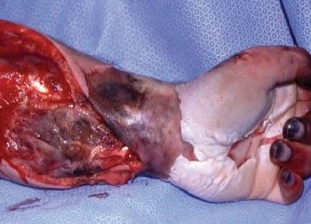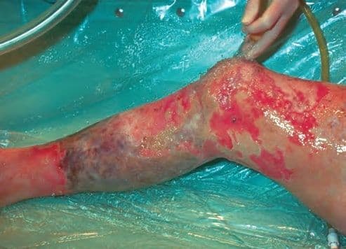 Регулярно робіть перев’язки з місцевим антисептиком, щоб запобігти колонізації бактерій, хірургічно сануйте рану після розмежування живої та мертвої тканини. Рання хірургічна санація або ампутація бувають необхідні рідко, якщо не відбувається інфікування.
