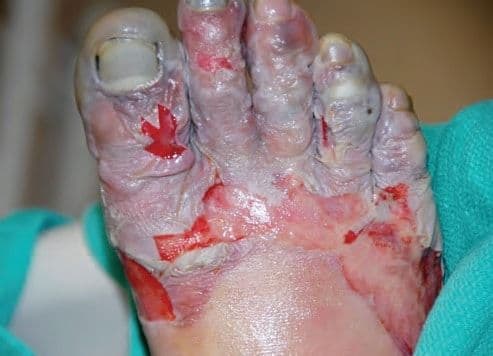 Незважаючи на те, що вся стопа може здаватися чорною, глибокого руйнування тканин може не відбуватися. Артеріальний вазоспазм змінюється на вазодилатацію, тоді як уражена тканина спочатку охолоджується і німіє, а потім стає гіперемованою через 24–48 годин.