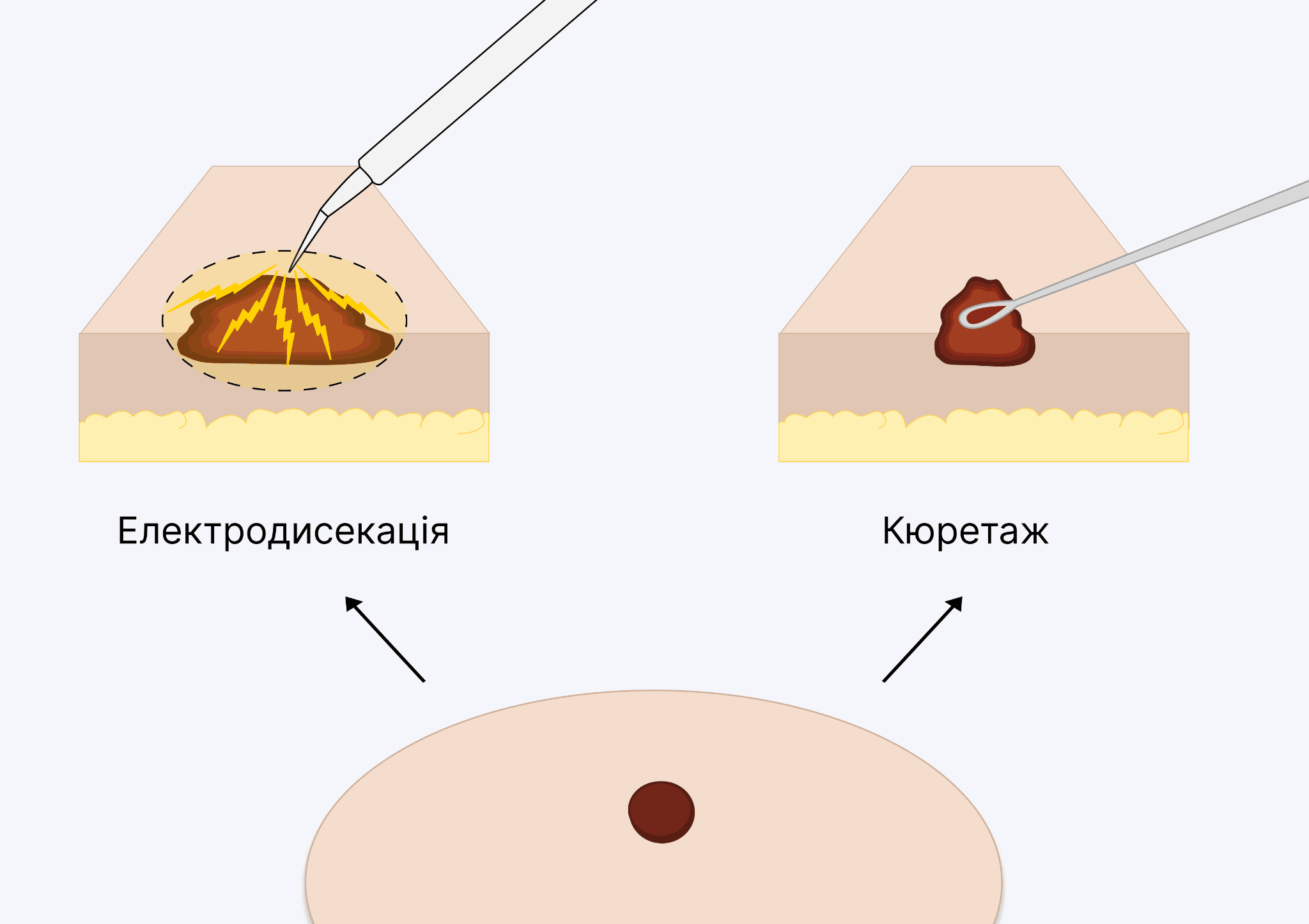 • Кюретаж та електродесикація. Лікар використовує спеціальний інструмент, який має лезо у вигляді круга (кюретка), щоб прибрати утворення до дерми, а потім залишок пухлини знищується за допомогою електричної голки.