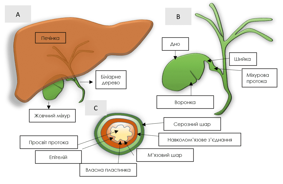 A) Жовчний міхур під печінкою, B) Анатомія жовчного міхура та жовчного дерева, C) Шари стінки жовчного міхура