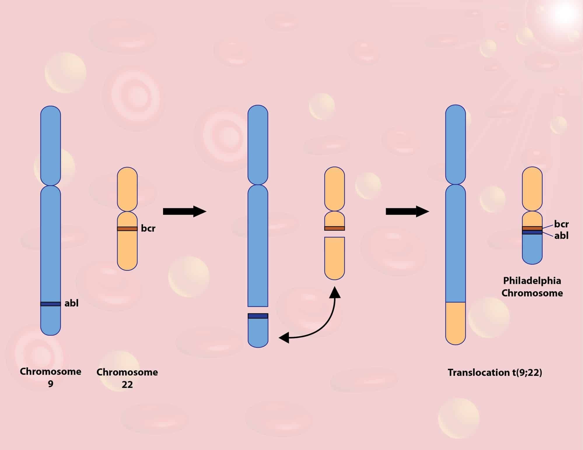 У 95% зразків кісткового мозку хворих із ХМЛ є так звана Філадельфійська хромосома. Формується вона, коли у стовбуровій клітині кісткового мозку 9 та 22 хромосоми обмінюються шматками і утворюється така міні-хромосомка, що несе специфічний ген (BCR-ABL). Він є своєрідною педаллю газу для клітини і змушує її постійно ділитися, зменшуючи потенціал до “дорослішання”.