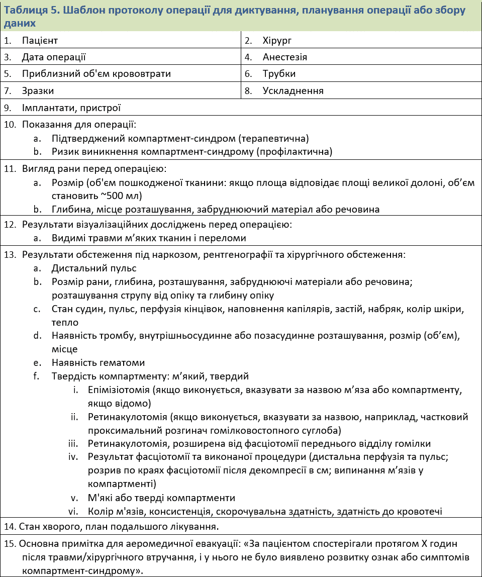 Таблиця 3. Дані для медичної документації щодо компартмент-синдрому під час бойових дій