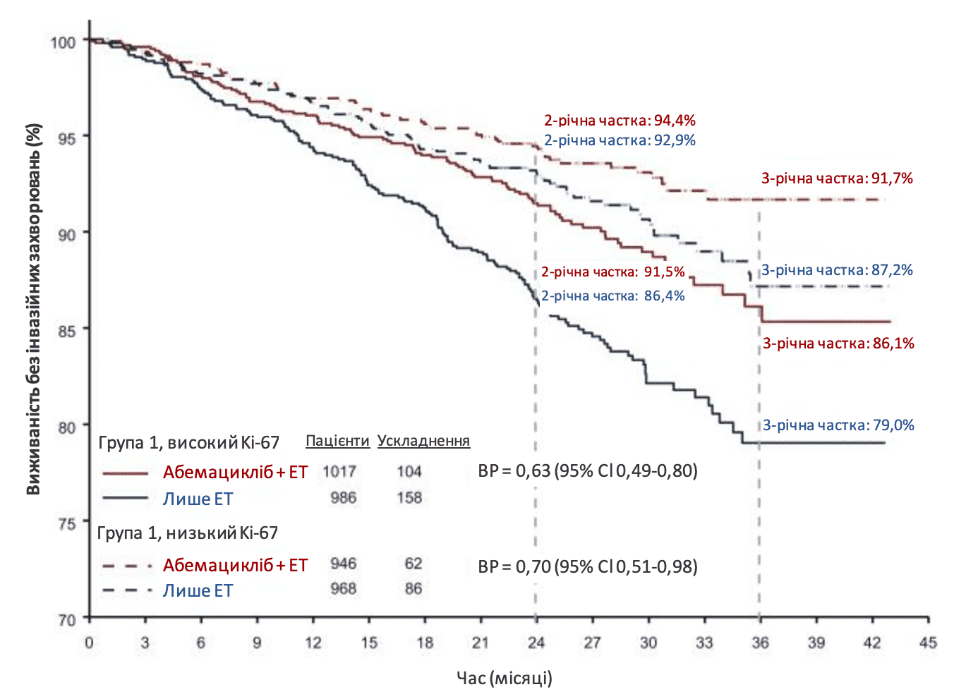 В групі з високим Ki-67 рівень покращення IDFS становив 7,1% (86,1% порівняно з 79%), тоді як у групі з низьким рівнем Ki-67 цей показник становив 4,5% (91,7% порівняно з 87,2%).