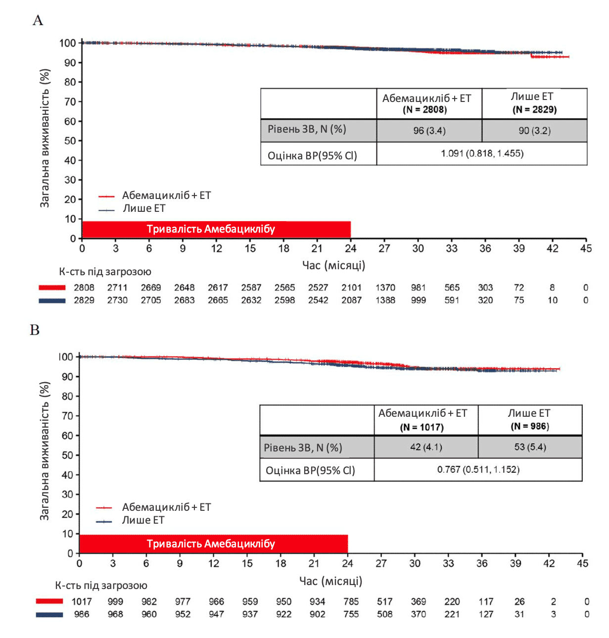У листі до редактора, опублікованому в Annals of Oncology, було оприлюднено дві криві ЗВ від monarchE: ЗВ для популяції ITT показала ВР=1,091 (95% Cl 0,818-1,455), з порівняною кількістю смертей в обох групах дослідження (3,4% проти 3,2%), тоді як ЗВ у зазначеній FDA популяції (характеристики високого ризику, Ki-67 ≥20%) показала ВР=0,767 (95% Cl 0,511 – 1,152) з дещо меншою кількістю смертей у групі абемациклібу (4,1% проти 5,4%).