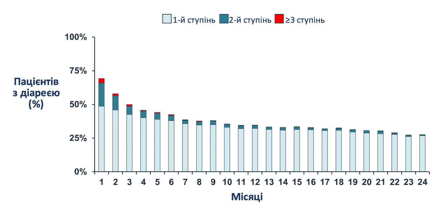 Частота діареї з часом зменшувалася, після 6-ти місяців лікування практично не спостерігалося тяжких випадків. Незважаючи на появу діареї, не було виявилено клінічно значущих відмінностей серед пацієнтів з побічними реакціями лікування між двома групами дослідження monarchE.[11]