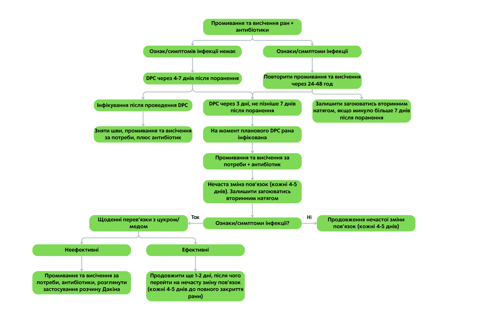 | Найкраще | Промити рану розведеним розчином Дакіна або стерильним ізотонічним розчином | |