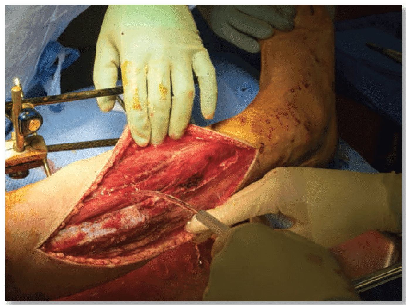 Визначити життєздатну тканину може бути складно. Явно змертвілу тканину слід видалити, тоді як тканину з невизначеною життєздатністю слід зберегти та повторно дослідити через 24–48 годин. Під час видалення м’язової тканини на додаток до клінічного судження використовуйте чотири «К»: колір, контракція (скорочення), консистенція та кровообіг.