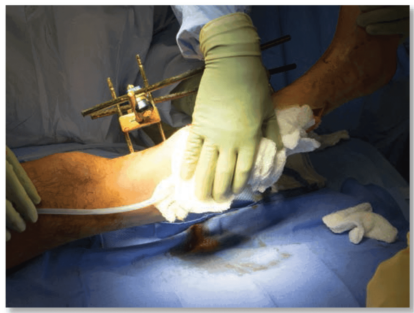 - Найкраще: працювати з помічником; видалити нежиттєздатну тканину за допомогою гострого розсічення (стерильним скальпелем або ножицями) і провести гемостаз за допомогою турнікета, топічних пов’язок з гемостатиком, прямого тиску, затискання, накладання лігатур та/або електрокоагуляції. Сумнівно життєздатна тканина може бути збережена до повторної процедури висічення, яку слід проводити кожні 24–48 годин, аж до прибуття в хірургічне відділення.[10]