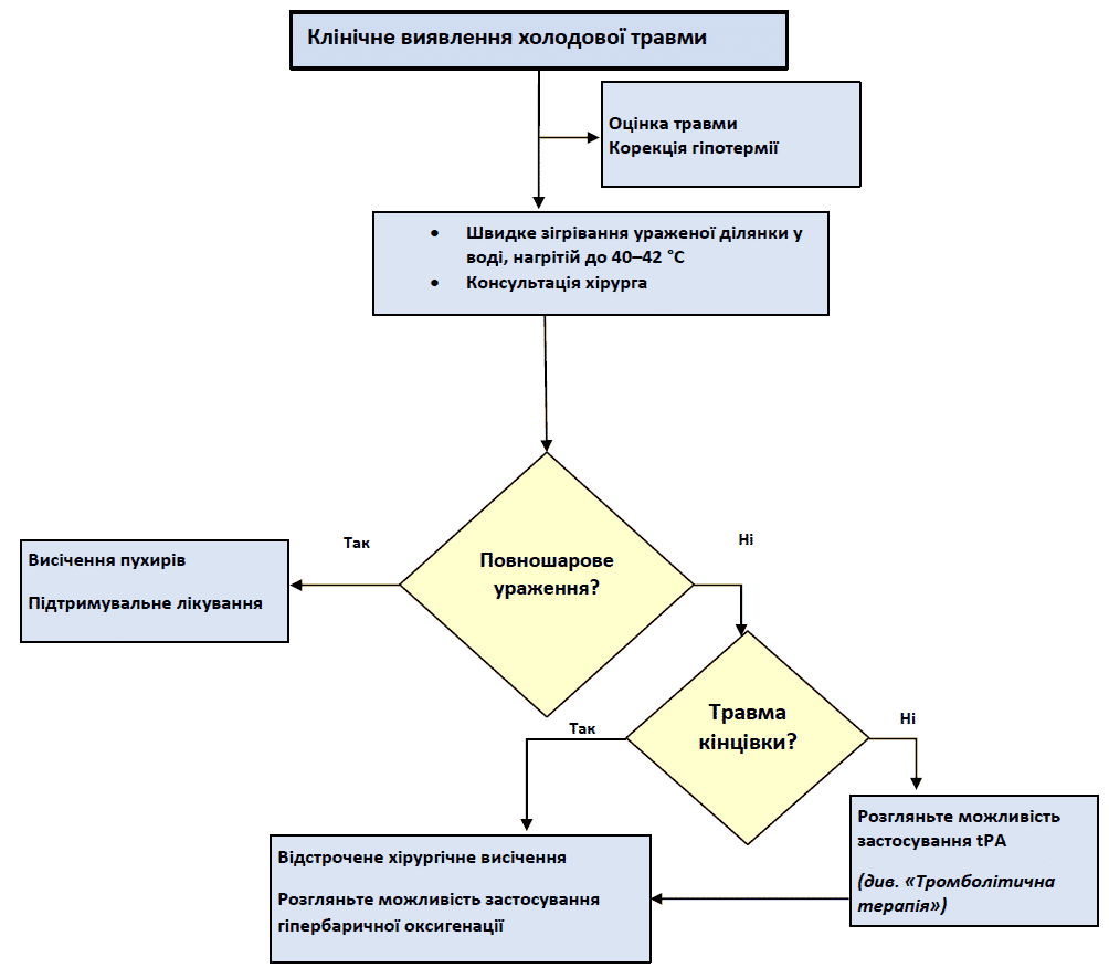 - Пацієнтам із тяжкою холодовою травмою (обмороження із некрозом тканин), які ТАКОЖ пройшли зігрівання не пізніше 24 годин після початку виникнення холодової травми, вводиться TPA, якщо для цього немає задокументованих протипоказань.