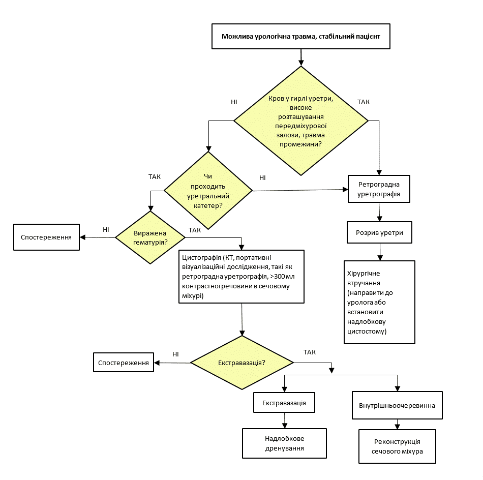 - Усі пацієнти з травмою сечостатевої системи (нирки, сечовід, сечовий міхур, яєчко/яєчники, статевий член, зовнішні статеві органи)