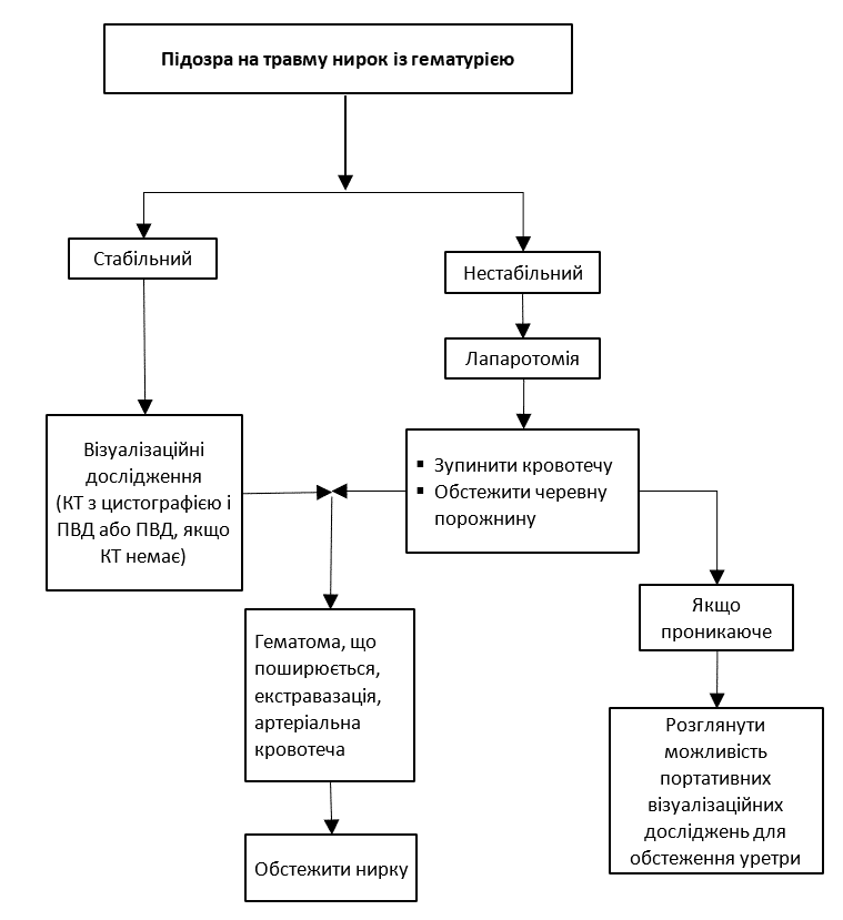 Алгоритмічний підхід до лікування травми нирок представлений на зображенні 2 нижче.