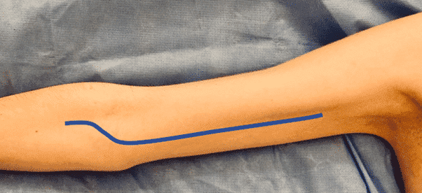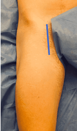 Підколінна артерія розміщена медіальніше вени. Для підколінного доступу зробіть поздовжній розріз на ширину пальця позаду від задньої межі великогомілкової кістки. Слідкуйте за тим, щоб уникати ВПВ поверхнево в цій ділянці, яка може бути візуалізована до розрізу за допомогою ультразвуку, якщо це доступно. Розріжте фасцію гомілки поздовжньо в тій же площині, що і початковий розріз, проксимально. Проксимальний доступ можна отримати шляхом поділу гусячої лапки – з’єднаного сухожилля кравецького, тонкого та півсухожилкового м’язів. Відведіть медіальну головку литкового м’яза дозаду.