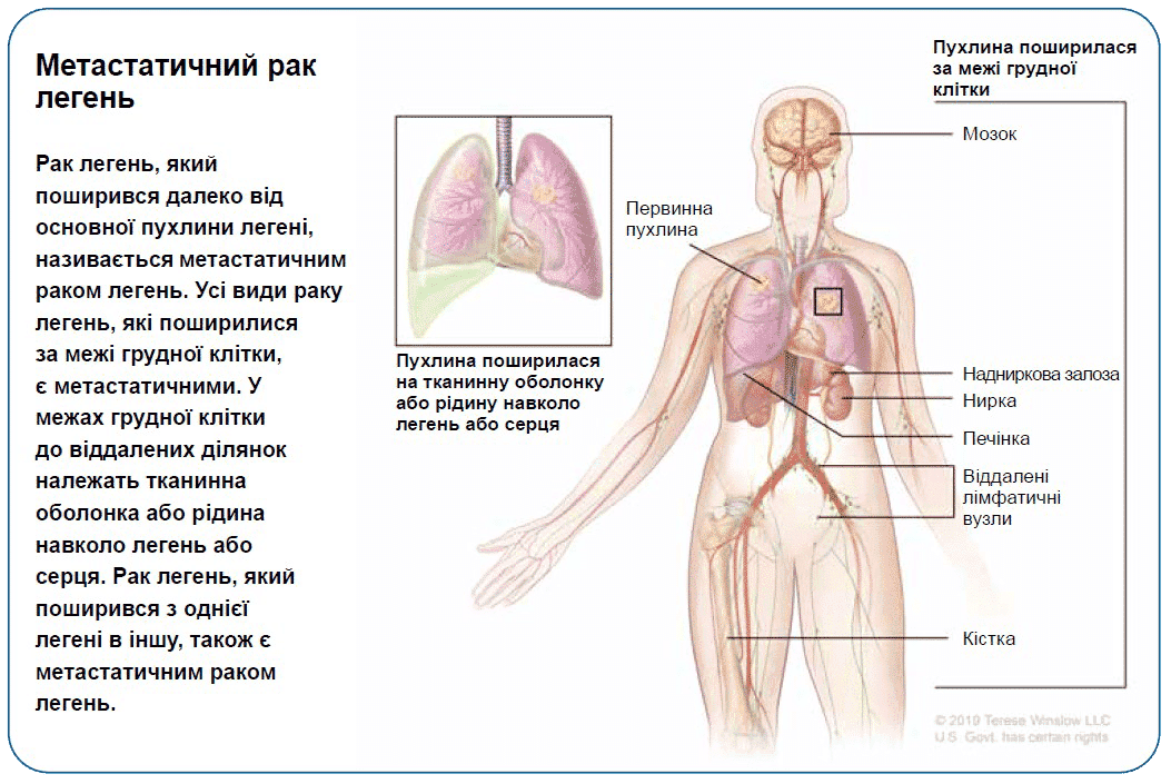 Поширення раку називають метастазуванням. Коли рак легень поширився далеко за межі першої пухлини легені, його називають метастатичним раком легень.