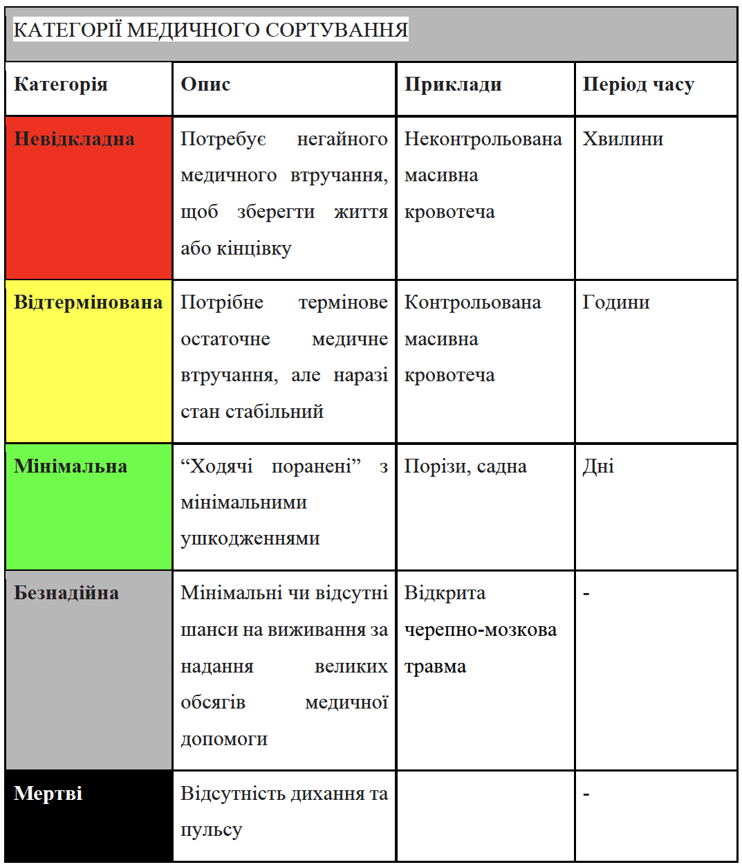 Пацієнти із важкими ураженнями, які скоріш за все виживуть за вчасно наданої медичної допомоги, мають пріоритет в її отриманні у порівнянні з тими, котрі мають менші шанси на виживання. Під час медичного сортування всі пацієнти поділяються на 5 категорій з відповідним кольоровим маркуванням: невідкладна (червоні), відтермінована (жовті), мінімальна (зелені), безнадійна (сірі) чи мертві (чорні).
