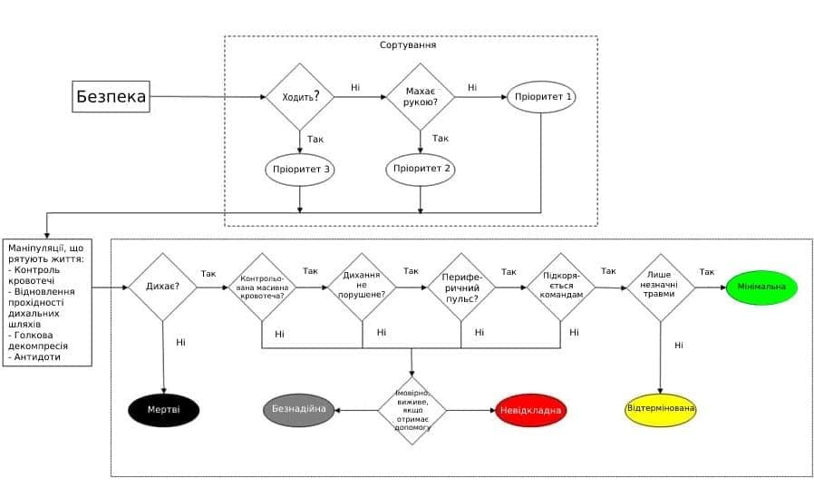- Якщо після первинних втручань пацієнт не дихає, пацієнт класифікується як мертвий (чорний колір).