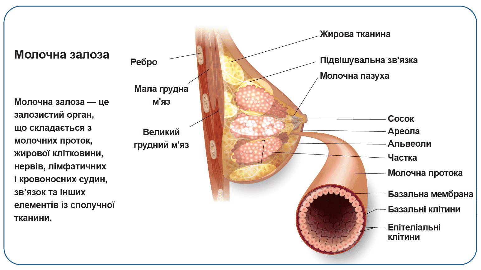 Молочна залоза — це залозистий орган, розташований на поверхні грудної клітки. Вона складається з молочних проток, жирової клітковини, нервів, лімфатичних і кровоносних судин, зв’язок та інших елементів із сполучної тканини. Позаду молочних залоз розташовані грудний м’яз і ребра. М’язи та зв’язки допомагають утримувати молочні залози.
