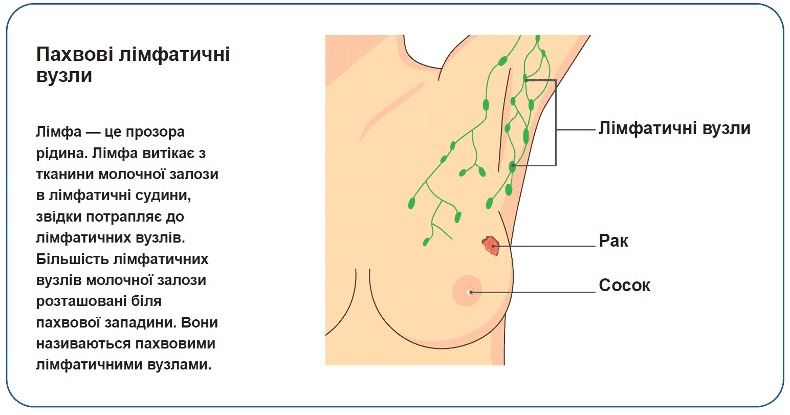 Лімфа — це прозора рідина, через яку клітини отримують воду та живлення. Лімфа також допомагає боротися з мікроорганізмами. Лімфа відтікає з тканини молочної залози в лімфатичні судини та надходить до лімфатичних вузлів біля пахвової западини. Лімфатичні вузли біля пахви називаються пахвовими (аксилярними) лімфатичними вузлами.