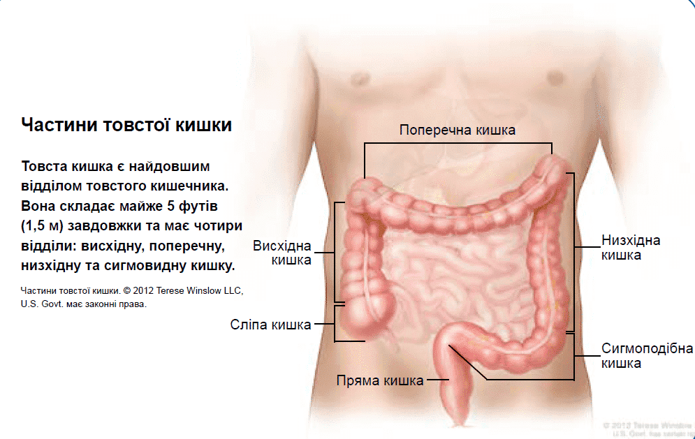 Товста кишка є першим і найдовшим відділом кишечника. Його довжина становить майже 5 футів (1,5м) і він складається з чотирьох частин: висхідна, поперечна, низхідна та сигмовидна кишка.