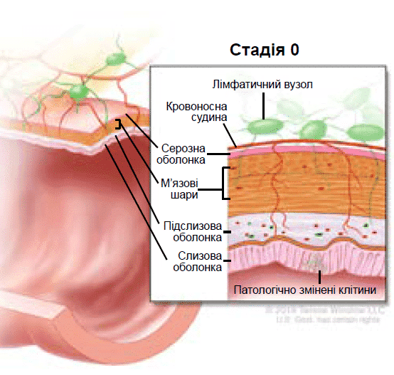 У внутрішньому шарі стінки товстої кишки є патологічні клітини. Ці патологічні клітини можуть перетворитися на ракові та поширитися в більш глибокі шари стінки товстої кишки. Рак товстої кишки стадії 0 також називають карциномою in situ товстої кишки.