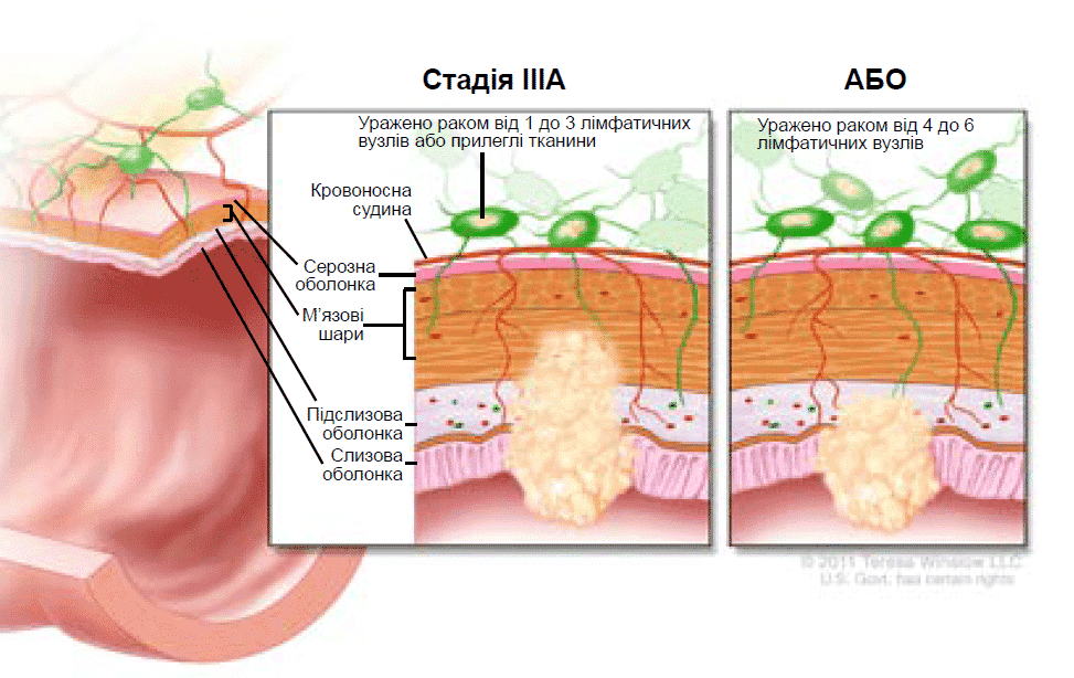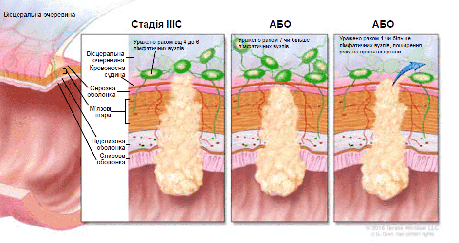 - T- tumor – пухлина: як далеко пухлина проросла в стінку товстої кишки або крізь неї.
