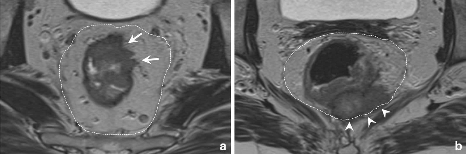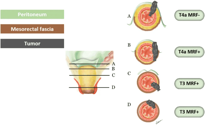 - Т4b включає залучення суміжних органів малого тазу, враховуючи матку, яєчники, піхву, сімʼяні міхурці, сечовий міхур, сечоводи, сечівник, кістки або наступні мʼзові структури: затульні, грушоподібні, ішиококцигеальні, пубококцигеальні мʼязи та леватори. Також консенсус пропонує додати в цю категорію залучення наступних структур: екстрамезоректальні судини, сідничні та крижові нерви, сакроспінозні та сакротуберозні звʼязки і мʼякі тканини за межами MRF – жирова клітковина затульного, клубового та ішиоректального просторів.