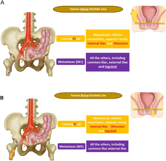 - Якщо пухлина розташована нижче зубчатої лінії – пахові лімфовузли також розглядаються як локорегіонарні.