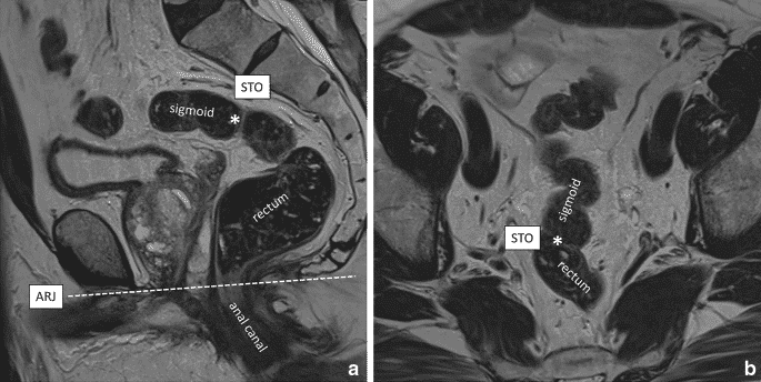 - Нижній край прямої кишки – аноректальний перехід. Анатомічно пряма кишка продовжується до зубчатої лінії, яка також візуалізується на МРТ.