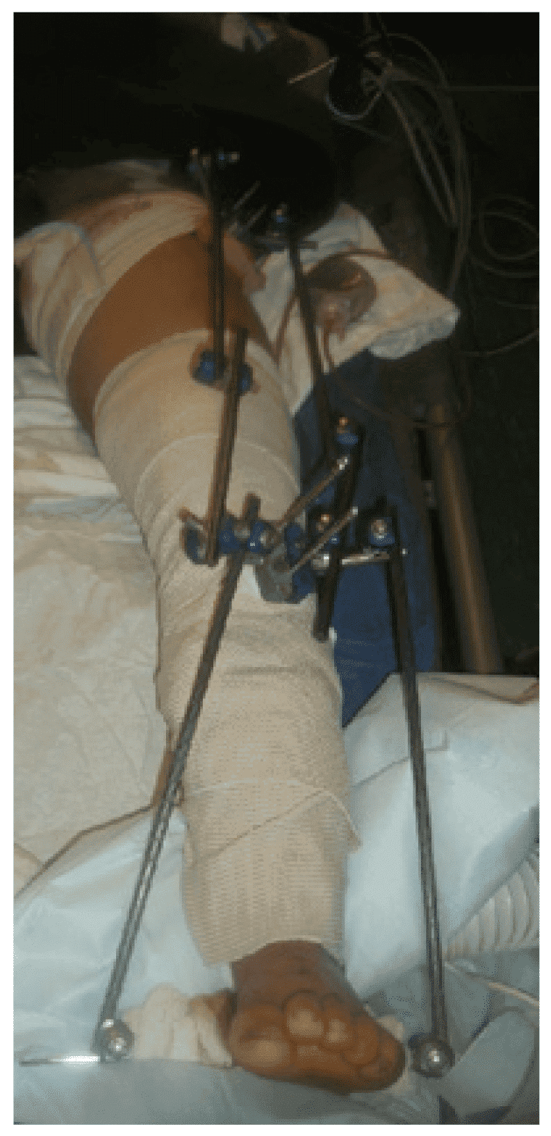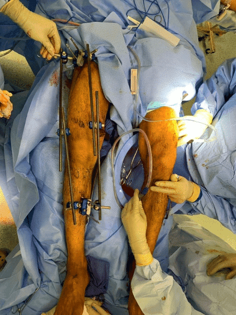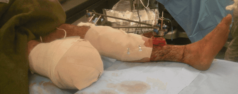 Зображення 5. Використання апарата зовнішньої фіксації для стабілізації нижньої кінцівки після вибухової травми