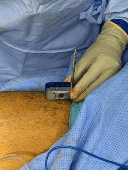 - **Важливі моменти. При вкручуванні стержнів у великогомілкову кістку доцільно почати свердління перпендикулярно до кістки та зробити заглиблення, не проходячи повністю через корковий шар, а потім змінити напрямок руки так, щоб вона вказувала на підлогу. Це може запобігти вислизанню дриля.