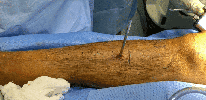 Великогомілкова кістка. Судинно-нервовий пучок проходить уздовж постеролатеральної поверхні кістки. Це дозволяє використати антеромедіальну поверхню для безпечного встановлення стержня. Тонкий шар підшкірної тканини, що покриває кістку, дозволяє легко виконувати пальпацію цієї поверхні по всій довжині. Слід уникати переднього гребеня великогомілкової кістки, оскільки він є значно товщим, ніж решта кістки, і встановити стержень буде важко навіть за допомогою електродриля. Стержні слід розміщувати приблизно на 1 см медіально від переднього гребеня, щоб уникнути його, оскільки надмірне свердління може призвести до термічного некрозу, послаблення стержня та можливої інфекції.
