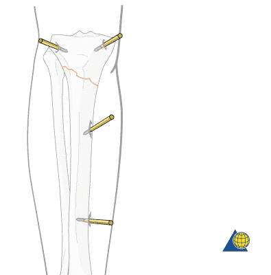 Передній вид великогомілкової кістки, на якому представлено встановлення стержня при переломі проксимального відділу великогомілкової кістки. У такому випадку також доцільно використовувати апарат зовнішньої фіксації для колінного суглоба