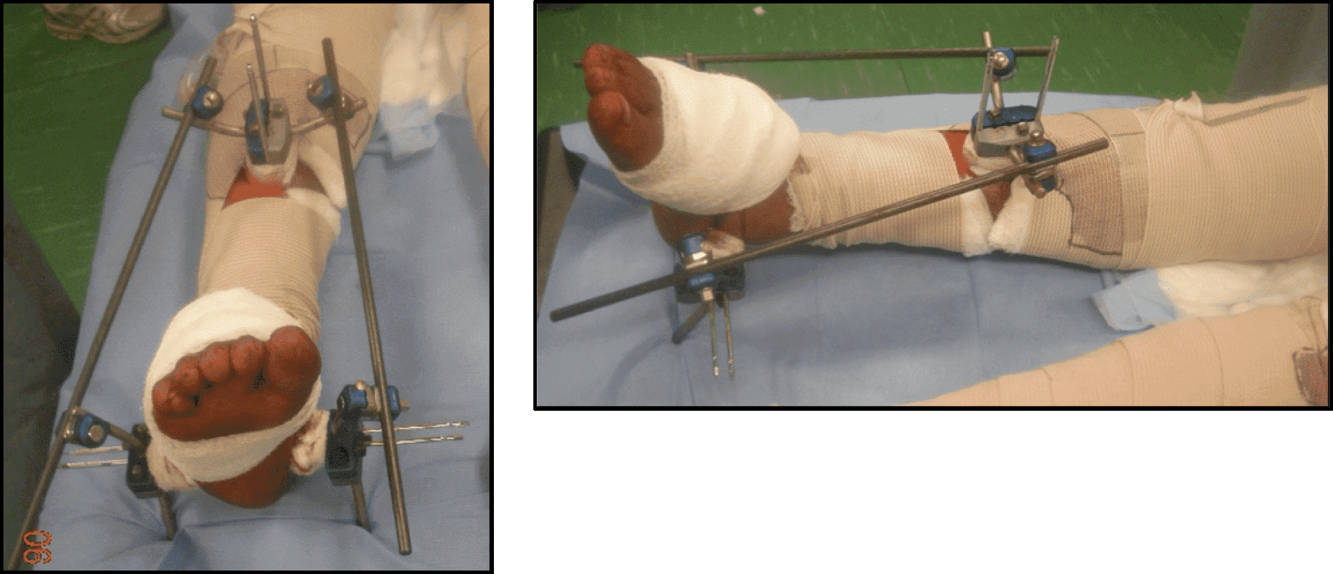 Приклад «дельтоподібної рами» для фіксації гомілковостопного суглоба з 2 трансфіксаційними п’ятковими стержнями, необхідними для з’єднання штанг із замками стержнів, якщо немає замків «стержень-штанга». Два стержні можуть зменшити потребу у задній шині, проте шина може бути корисною для додаткового захисту м’яких тканин і запобігання підошовному згинанню передньої частини стопи. Зверніть увагу на два додаткові задні стержні-«підставки», що зменшують безпосередній тиск на п’ятку.