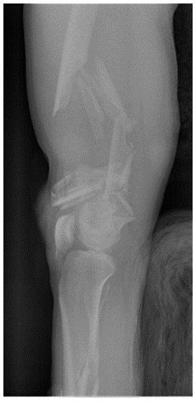 На базовій рентгенограмі, отриманій перед процедурою, видно осколкові переломи у дистальній третині стегнової кістки та середній ділянці тіла великогомілкової кістки. Над колінним суглобом було розташовано апарат зовнішньої фіксації, тоді як розширений зовнішній фіксатор у вигляді «дельтоподібної рами» використовує замок стержня у проксимальній ділянці великогомілкової кістки для стабілізації сегментарного перелому великогомілкової кістки.