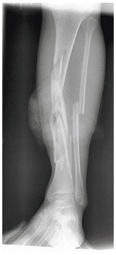 - IIIb. Поранення з переломом > 10 см з розчавленням тканини та забрудненням і недостатнім покриттям м’якими тканинами, пов’язаним з відшаруванням окістя, що часто вимагає пересадки шкіри з використанням ротаційного або васкуляризованого клаптя.