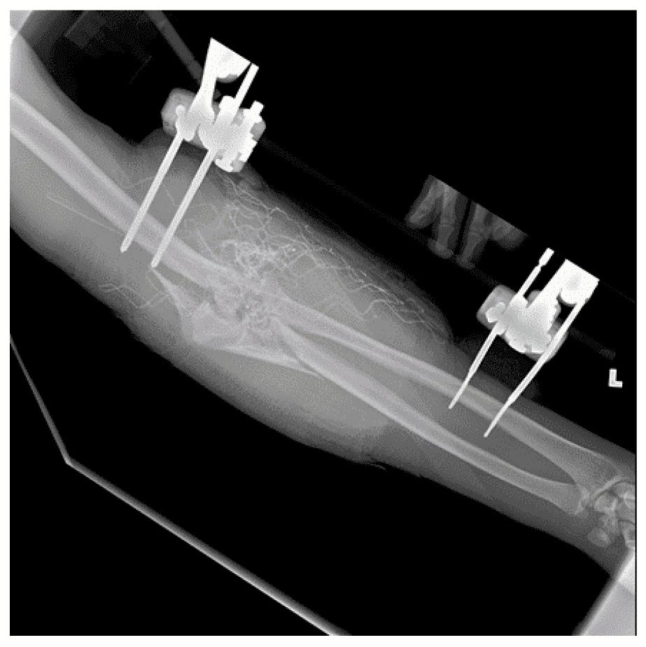Зовнішній фіксатор верхньої кінцівки, використаний при відкритому осколковому внутрішньосуглобовому переломі дистального відділу плечової кістки з ушкодженням плечової артерії внаслідок високошвидкісного вогнепального поранення. Було використано апарат зовнішньої фіксації швидкого застосування зі встановленням менших стержнів у дистальну третину променевої кістки та подальшим шунтуванням плечової артерії, після чого було виконано висічення та промивання поранень.