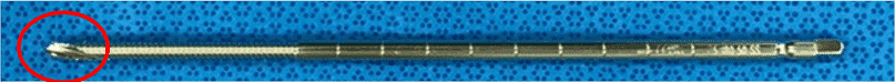 - Саморізний кінчик стержня (обведено на малюнку) слід провести через кістку, щоб забезпечити повне зчеплення різьби.