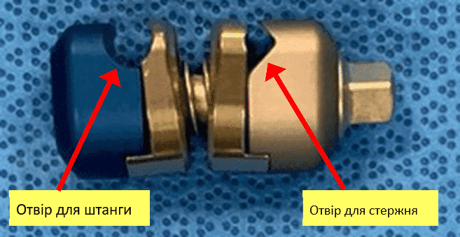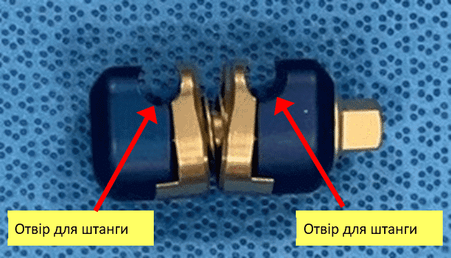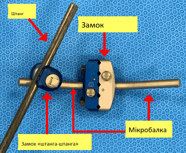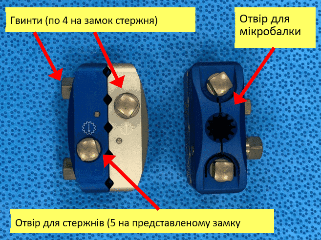 5. Замки «штанга-штанга»: замки з двома отворами, по одному на кожну штангу. Вони дозволяють приєднати мікробалки до штанги або, якщо потрібно видовжити зовнішній фіксатор, з’єднати дві штанги.